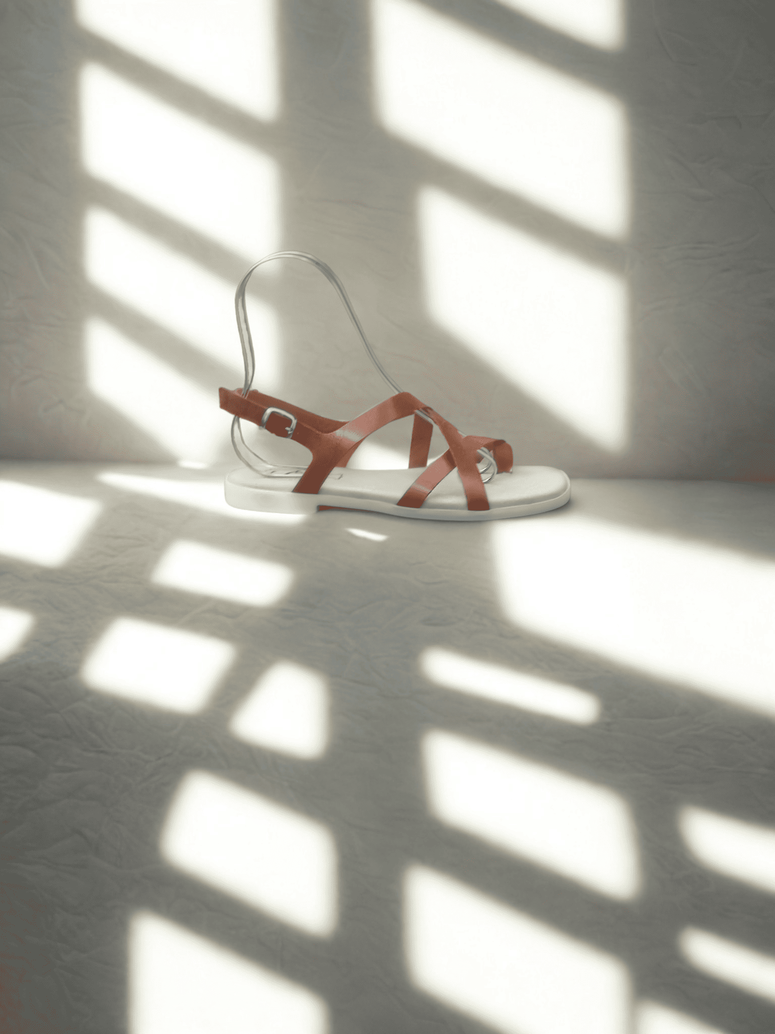 Minerva está elaborada en piel color avellana, con tiras cruzadas que se adaptan al pie y sujetan con estilo.