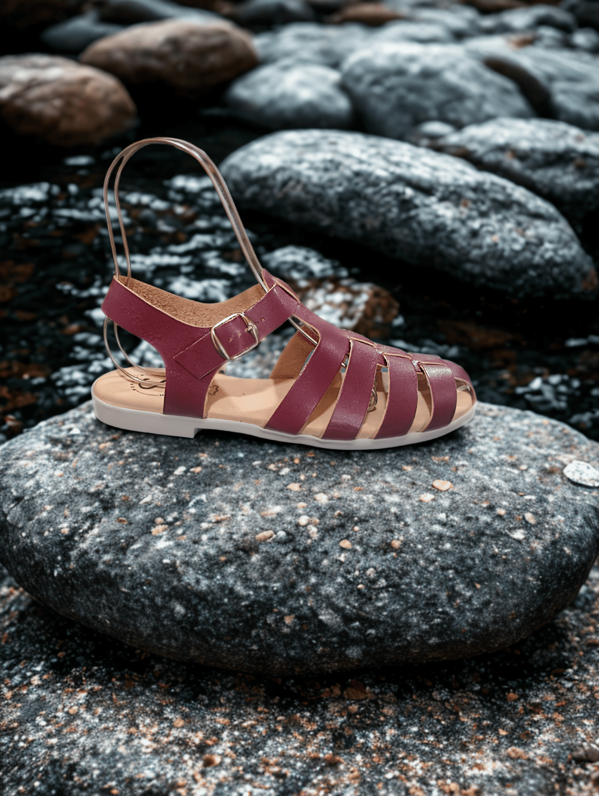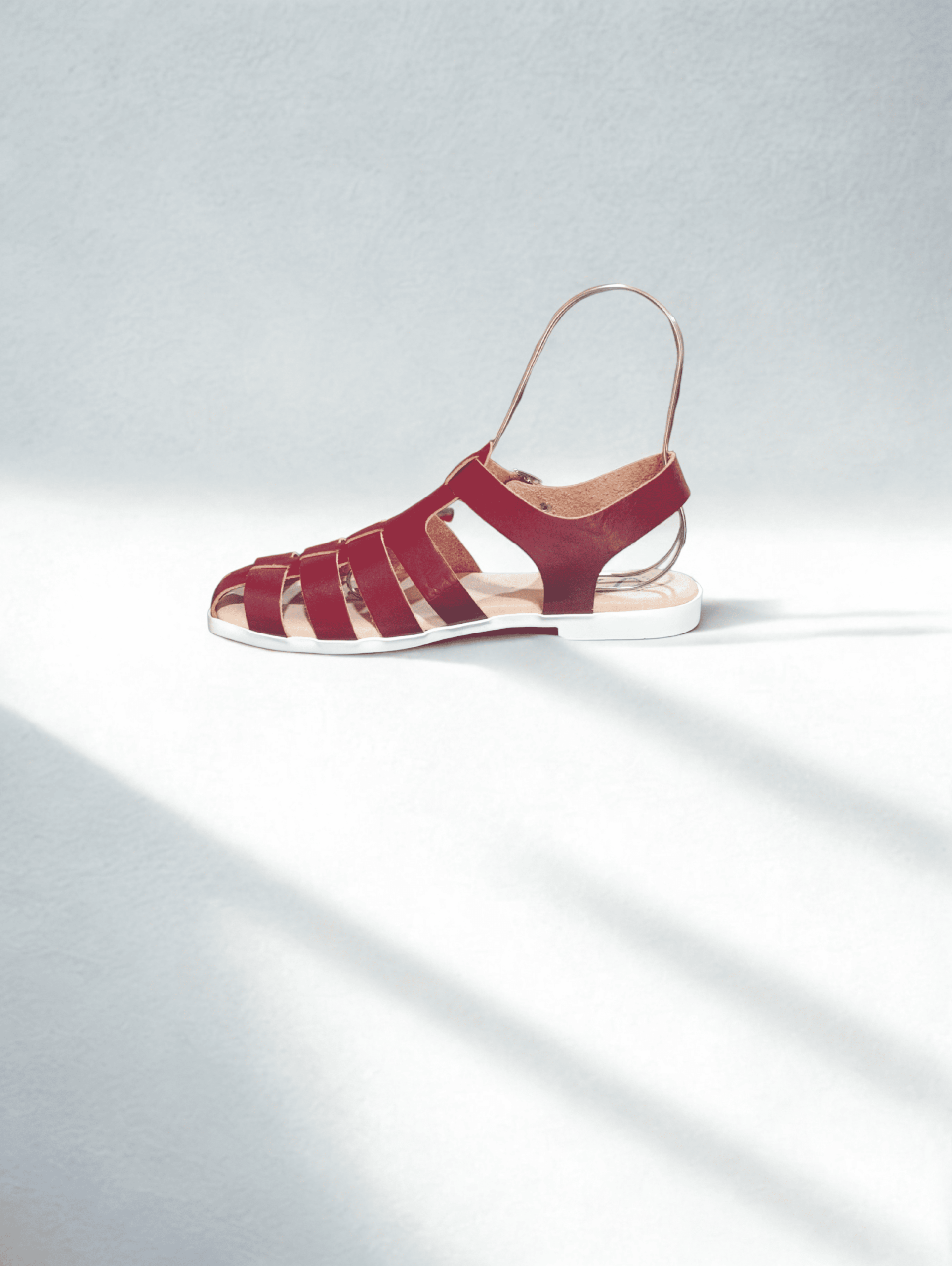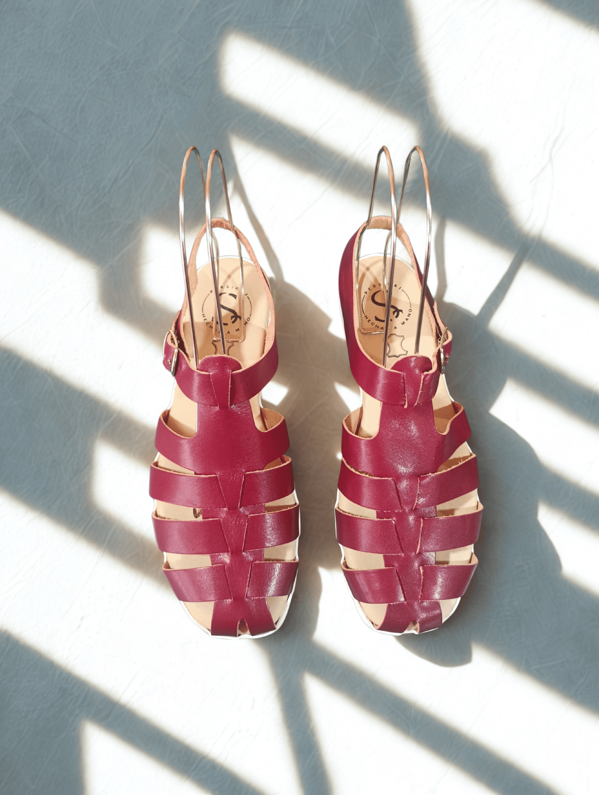Inspiradas en las clásicas cangrejeras, reinventadas con piel color cereza y un diseño que combina tradición y carácter.