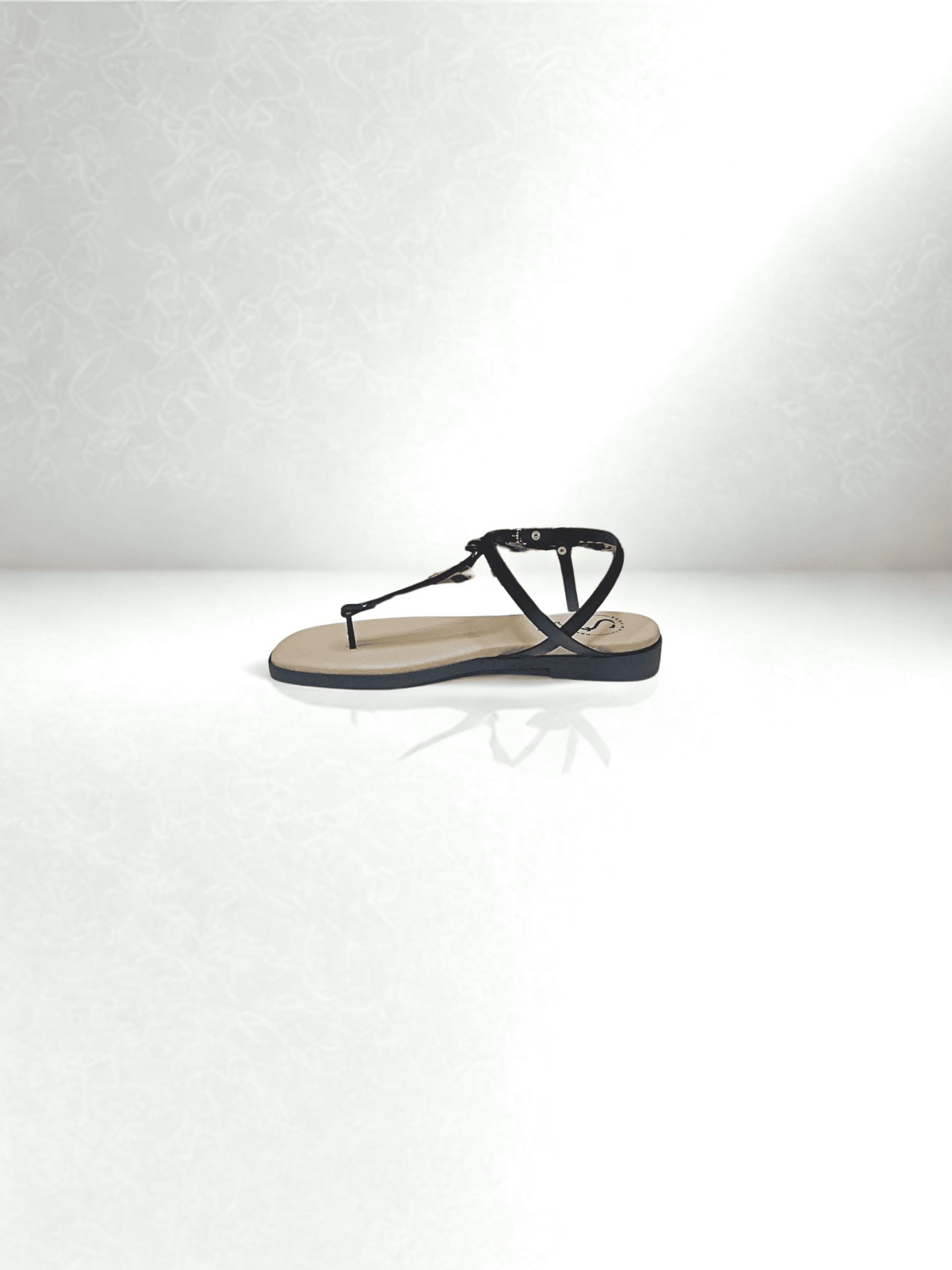 Sandalia minimalista de tiras sintéticas color negro con cierre en forma de pulsera al tobillo.